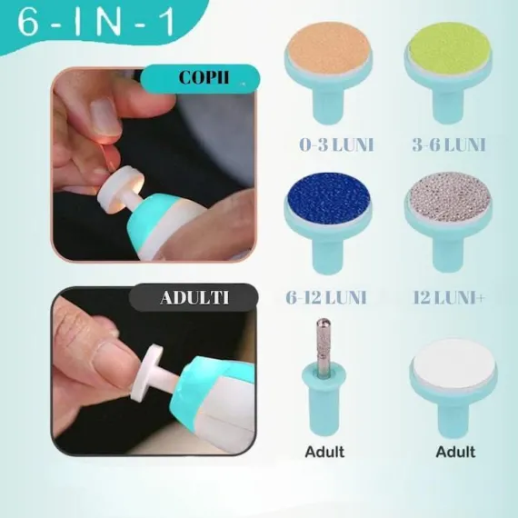 Pila electrica pentru bebelusi – ingrijirea unghiilor micutului tau devine simpla, sigura si rapida. Cu 6 capete rotative, functionare silentioasa si lumina LED pentru precizie, aceasta pila transforma rutina zilnica intr-un moment sigur si placut. Compacta si usor de folosit, este accesoriul indispensabil pentru parintii grijulii.