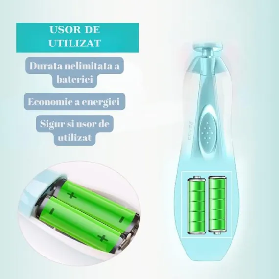 Un alt avantaj al acestei pile este functionarea silentioasa, ceea ce permite utilizarea chiar si in timpul somnului bebelusului. Lumina LED integrata asigura vizibilitate perfecta, astfel incat sa poti slefui unghiile cu exactitate, fara sa pierzi detalii. Necesita 2 baterii AA. Parintii pot astfel sa evite taieturile accidentale si sa transforme rutina intr-un moment calm si placut.