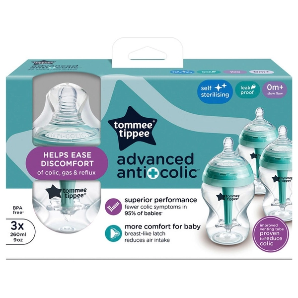 Set 3 biberoane Tommee Tippee Advanced Anti Colic este gandit special pentru mamicile care isi doresc ca bebelusul lor sa aiba parte de mese linistite, fara disconfort si plansete cauzate de colici. Sistemul inovator de dezaerare reduce inghitirea aerului, prevenind aparitia gazelor, refluxului sau balonarii. Astfel, mesele devin mai relaxante, iar tu te bucuri de momente pline de liniste alaturi de cel mic.