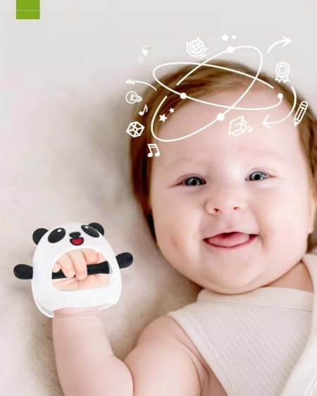 Jucarie model panda – dimensiuni 7,5 x 11 cm, potrivita pentru micile maini ale bebelusilor.