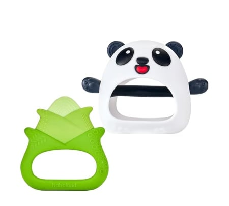Set 2 jucarii dentitie Hahaland din silicon, fara BPA, pentru bebelusi 0-9 luni. Confort, siguranta si design atractiv pentru gingii sensibile.