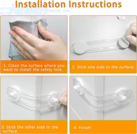Incuietorile pot fi montate in doar cateva secunde, fara a gauri mobilierul sau a folosi scule complicate. Adezivul special asigura o fixare puternica, dar se poate indeparta fara a lasa urme sau reziduuri, protejand astfel suprafetele. Aceasta caracteristica face produsul ideal pentru orice tip de mobila, chiar si cea delicata.