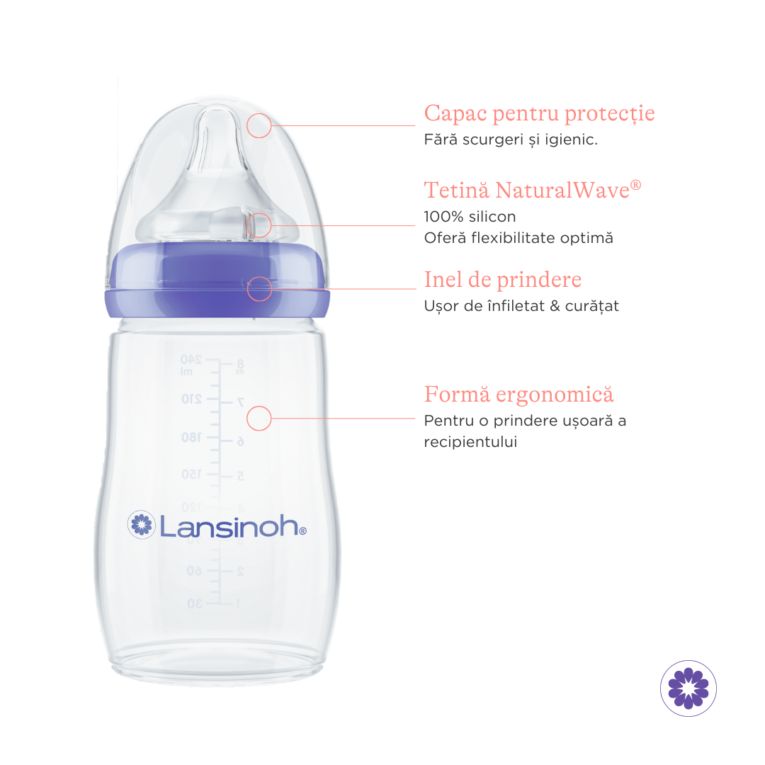 Set de biberoane cu tetina NaturalWave Lansinoh, 160 ml și 240 ml, fără BPA/BPS. Tetina flexibilă imită alăptarea, reduce colicile și permite trecerea ușoară sân-biberon. Include 3 tetine și capac pentru depozitare.