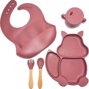 Set vesela bebelusi Orangu-gu maro, 5 piese – din silicon si lemn, include farfurie cu ventuza, salopeta impermeabila, sticla anti-varsare si tacamuri moi.