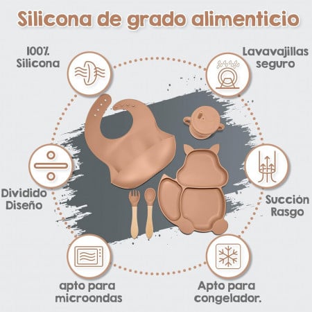 Set de vesela pentru bebelus maro, silicon/lemn, 5 piese