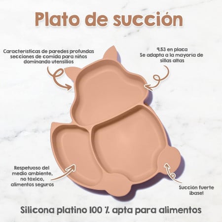 Farfuria este prevazuta cu o ventuza mare care o fixeaza de masa, prevenind alunecarea si varsarea alimentelor. Are forma de veverita simpatica.