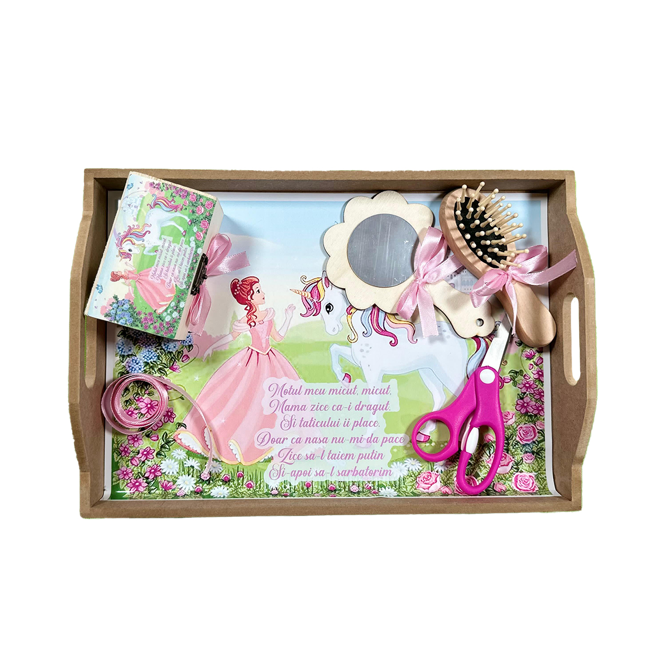Setul include si o serie de accesorii esentiale pentru ceremonia de taiere a motului. Peria de par, cu un design delicat si usor de manevrat. Este perfecta pentru a aranja parul bebelusului inainte de taierea motului. Oglinda in forma de floare adauga un plus de distractie, permitand bebelusului sa se priveasca dupa ce a fost tuns. Tavita mot bebelusi este speciala pentru evenimentul acesta!