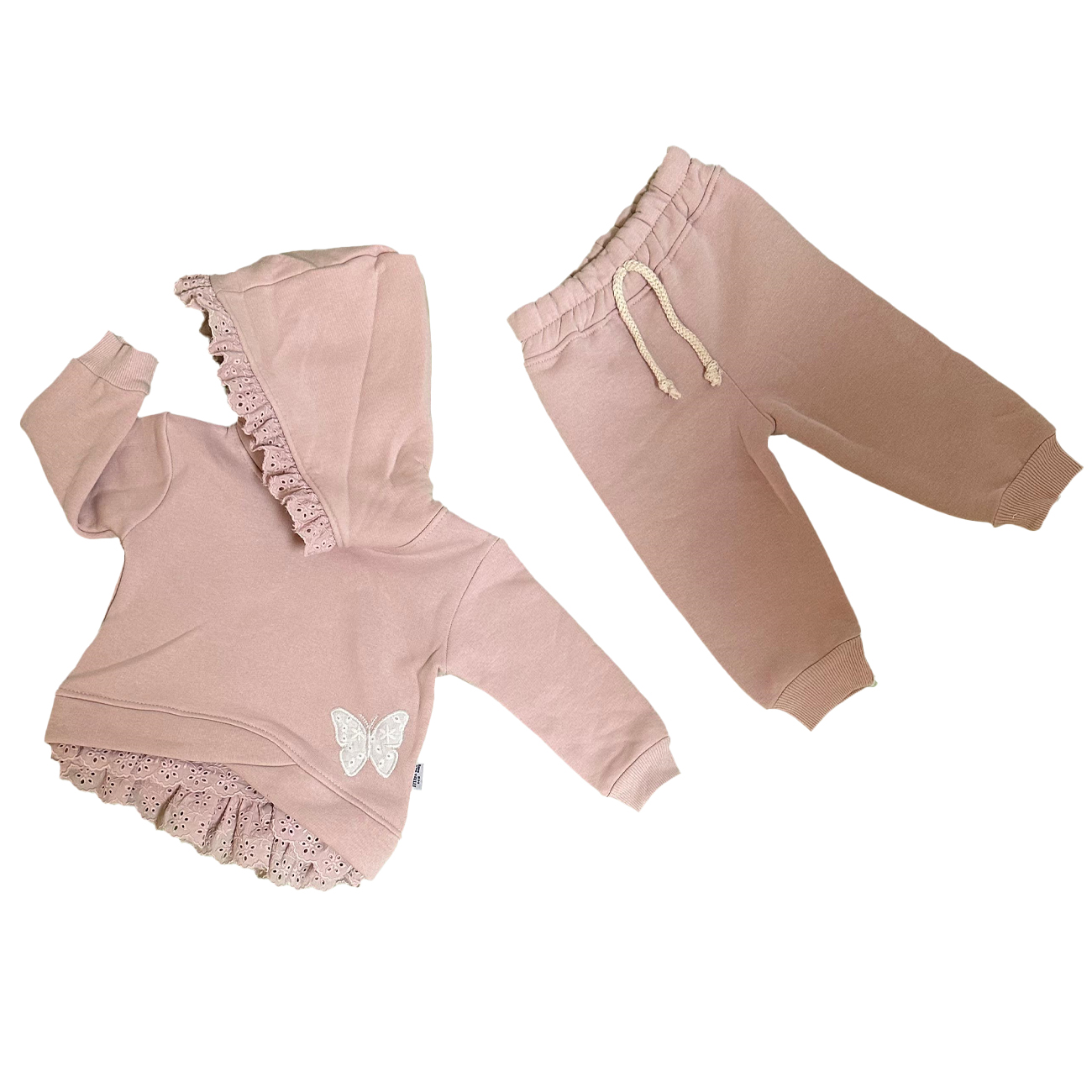 Hanoracul are o gluga decorata cu volane delicate, adaugand un plus de eleganta acestui outfit de iarna. Pe partea frontala este aplicat un fluturas adorabil, oferind un design dulce si jucaus. Detaliile cu volan si modelul fluture fac din acest hanorac o piesa vestimentara plina de farmec.